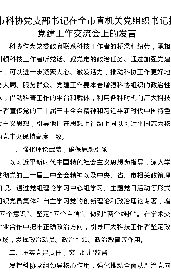 市科协党支部书记在全市直机关党组织书记抓党建工作交流会上的发言