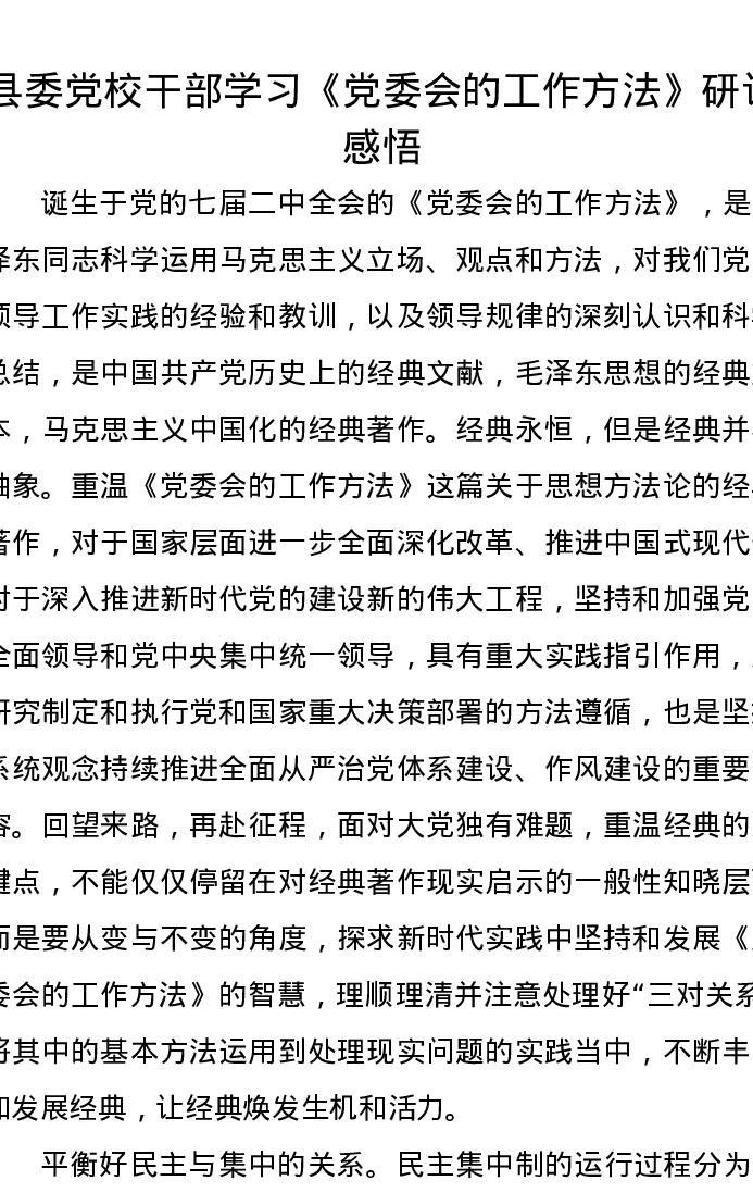 县委党校干部学习《党委会的工作方法》研讨心得感悟