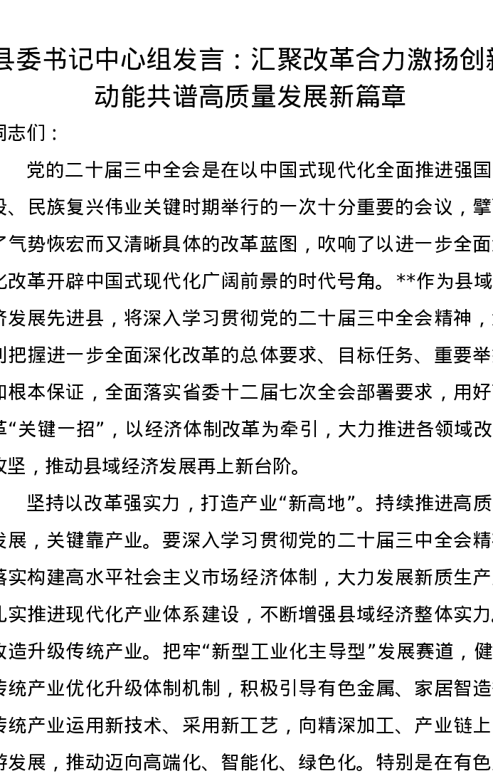 县委书记中心组发言:汇聚改革合力,激扬创新动能,共谱高质量发展新篇章