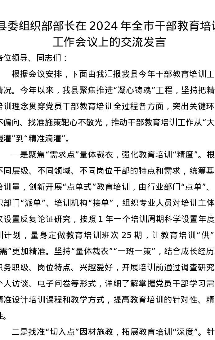 县委组织部部长在2024年全市干部教育培训工作会议上的交流发言