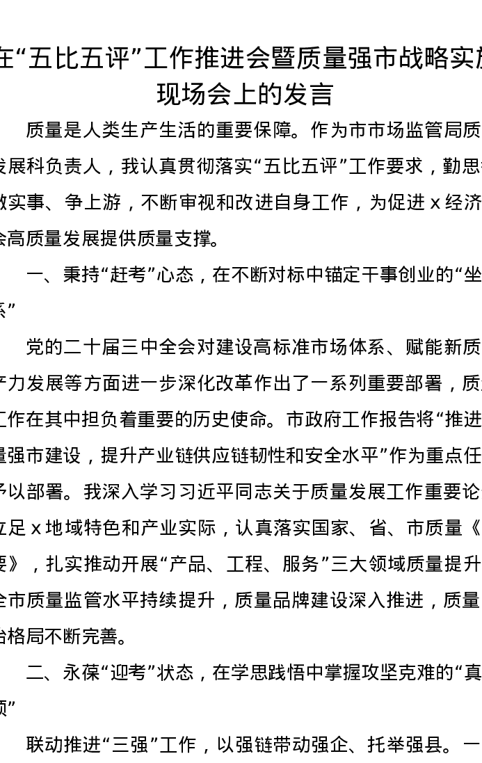 在“五比五评”工作推进会暨质量强市战略实施现场会上的发言