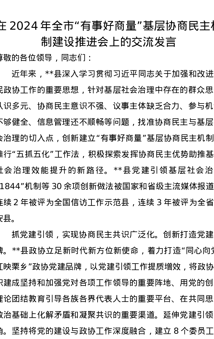在2024年全市“有事好商量”基层协商民主机制建设推进会上的交流发言