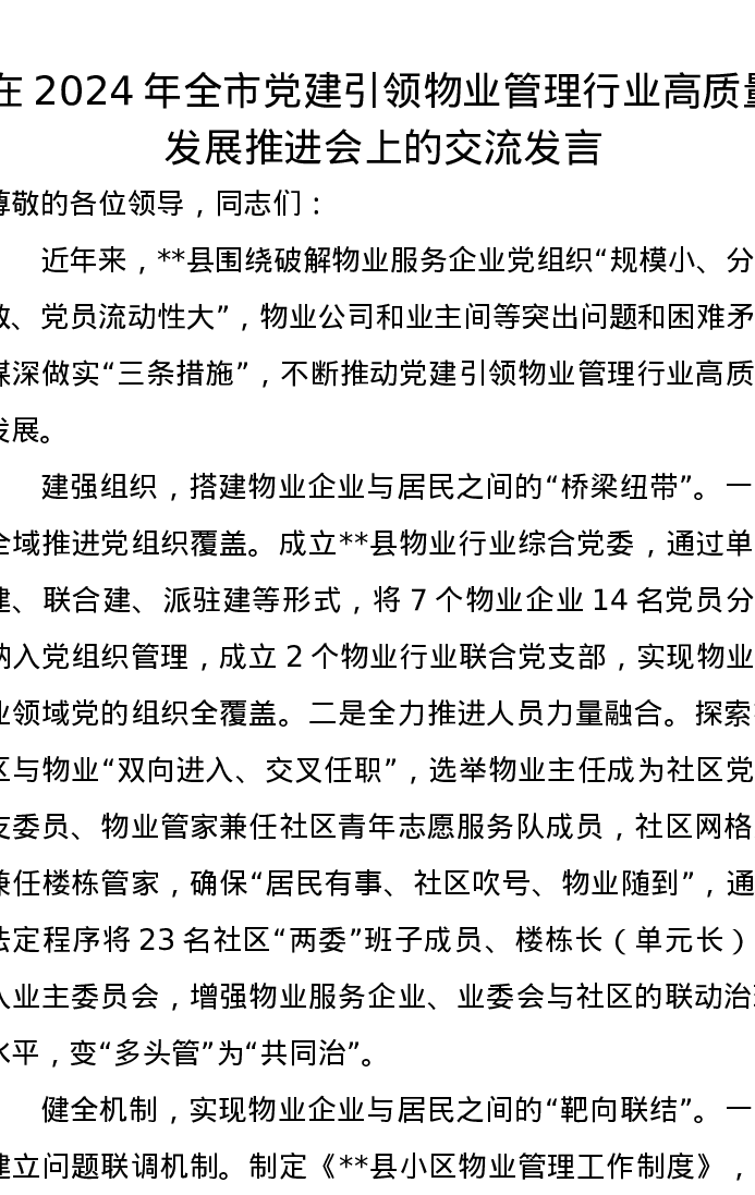 在2024年全市党建引领物业管理行业高质量发展推进会上的交流发言