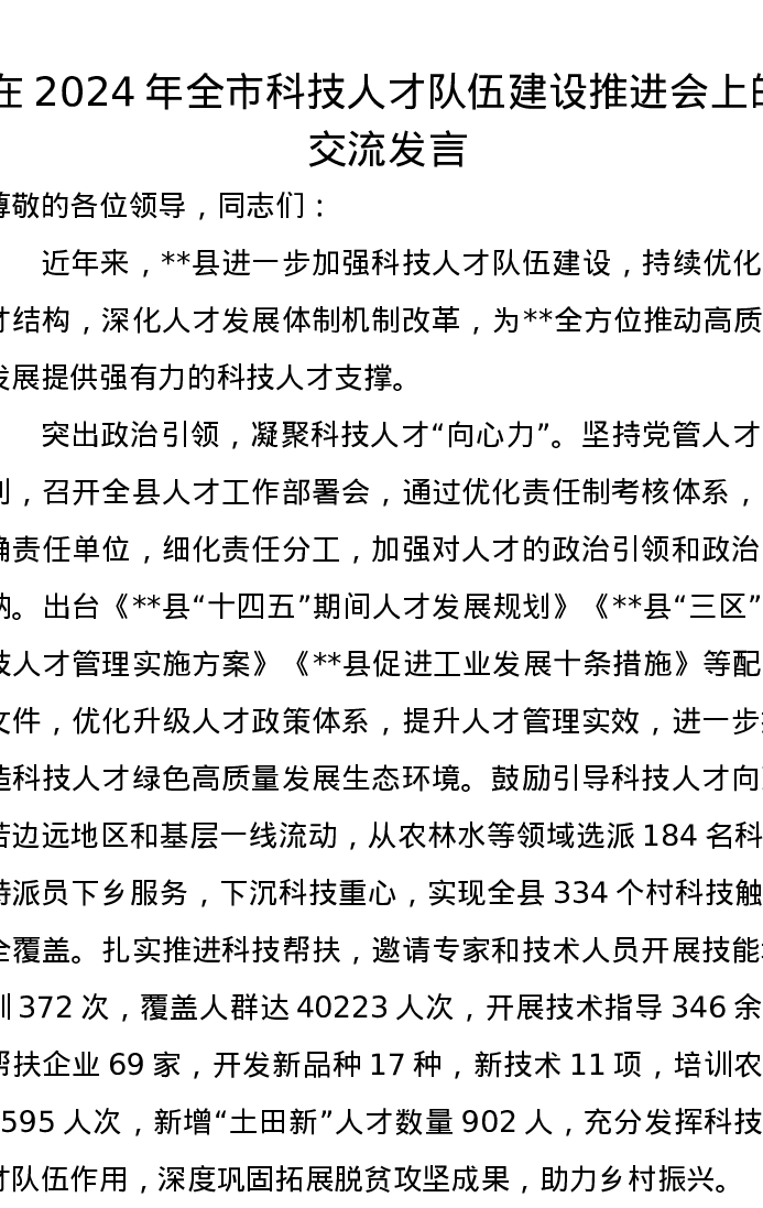 在2024年全市科技人才队伍建设推进会上的交流发言