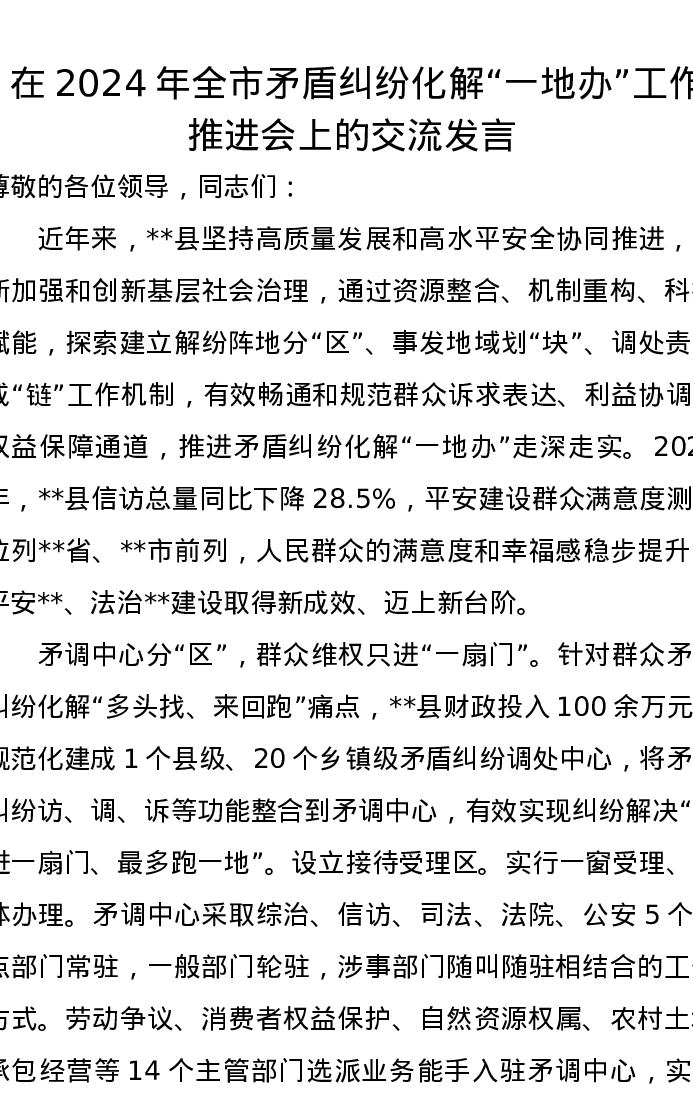 在2024年全市矛盾纠纷化解“一地办”工作推进会上的交流发言