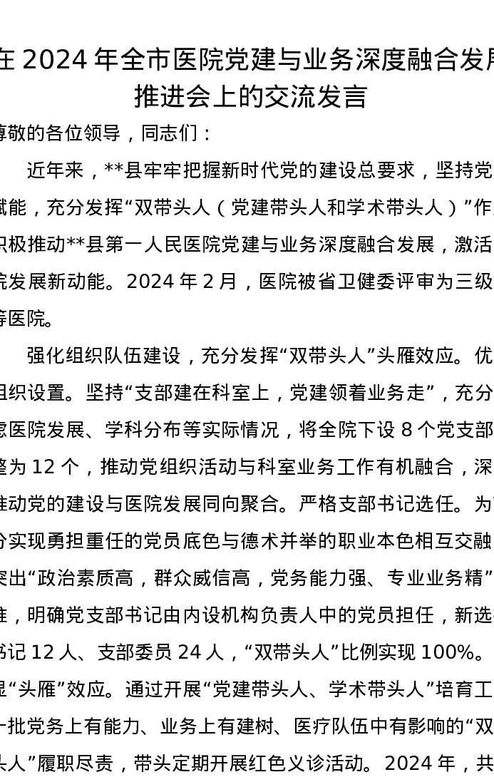 在2024年全市医院党建与业务深度融合发展推进会上的交流发言
