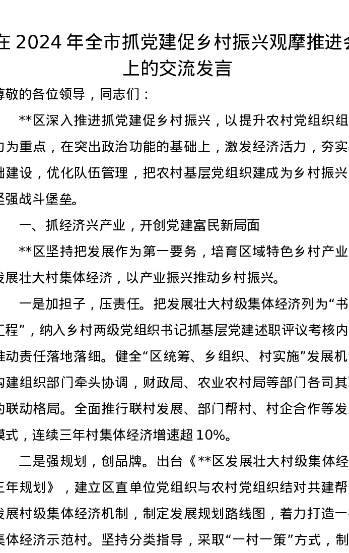 在2024年全市抓党建促乡村振兴观摩推进会上的交流发言