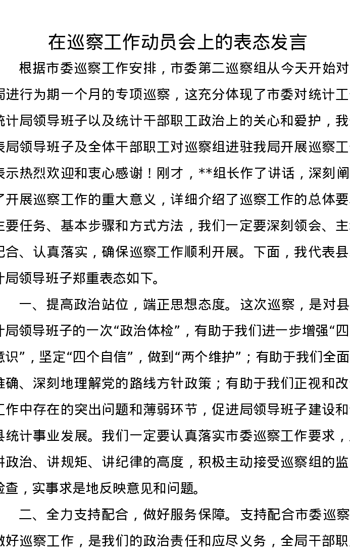 在巡察工作动员会上的表态发言