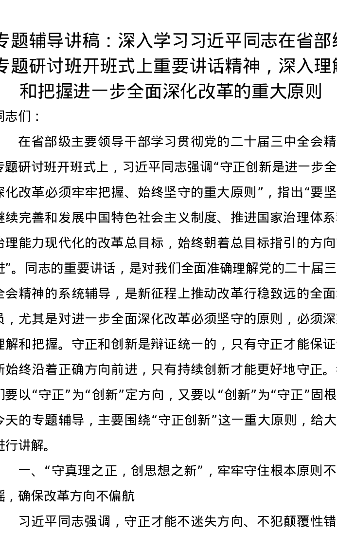 专题辅导讲稿:深入学习习近平总书记在省部级专题研讨班开班式上重要讲话精神,深入理解和把握进一步全面深化改革的重大原则