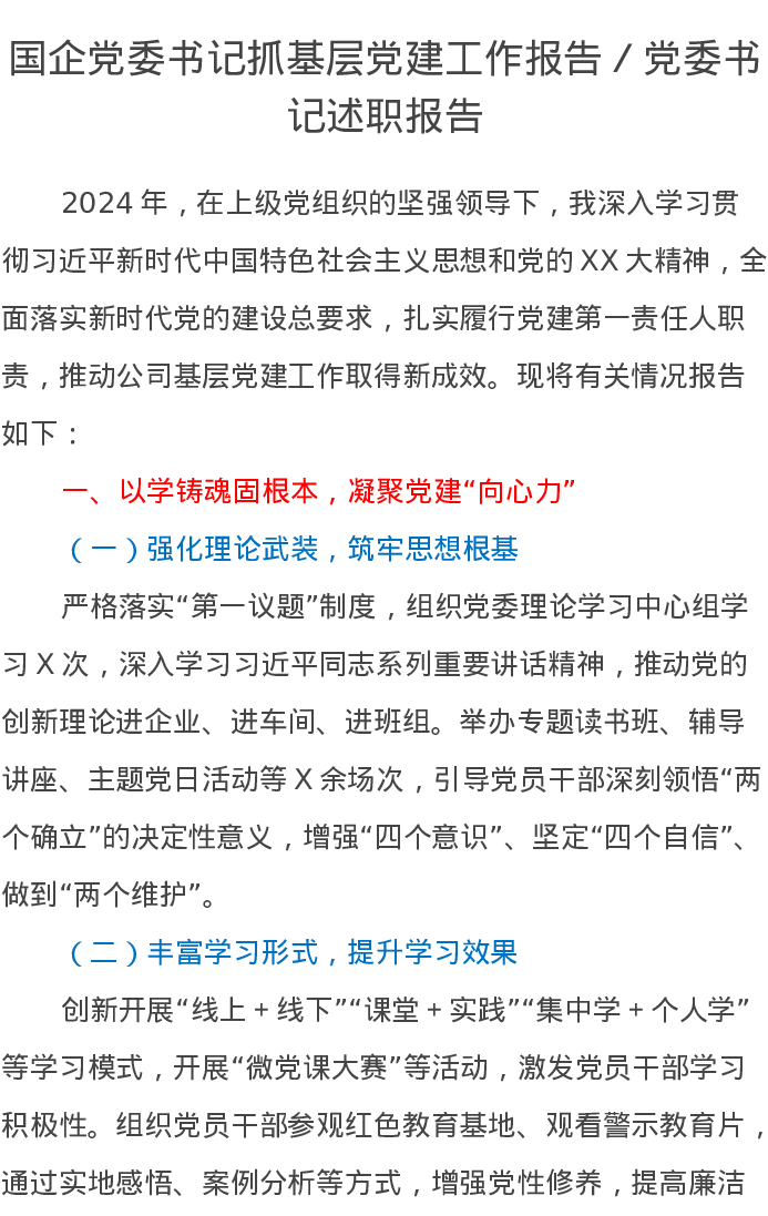国企党委书记2024年抓基层党建工作报告/党委书记述职报告