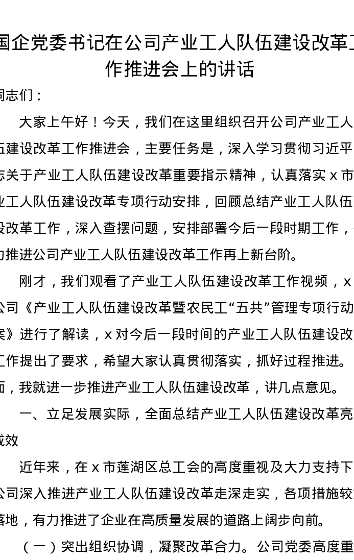 国企党委书记在公司产业工人队伍建设改革工作推进会上的讲话