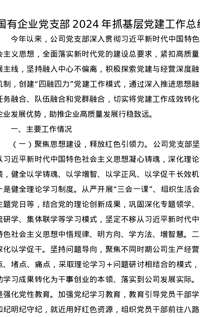 国有企业党支部2024年抓基层党建工作总结