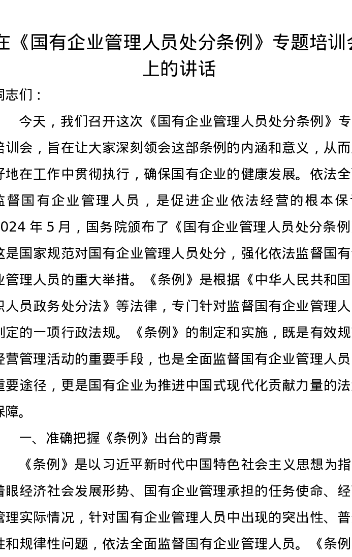 在《国有企业管理人员处分条例》专题培训会上的讲话
