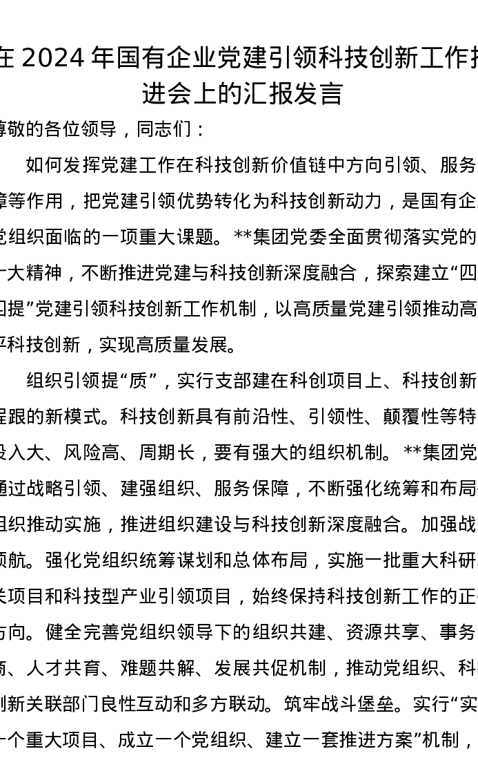 在2024年国有企业党建引领科技创新工作推进会上的汇报发言