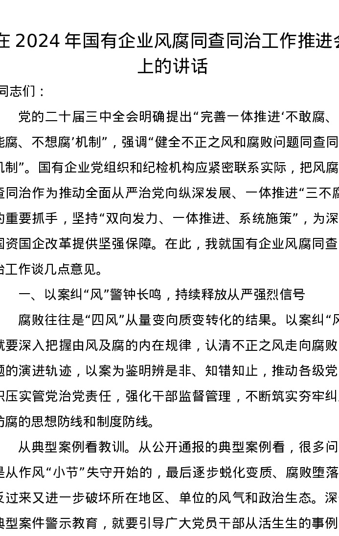 在2024年国有企业风腐同查同治工作推进会上的讲话