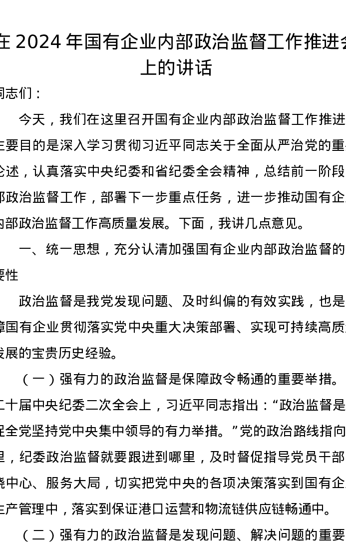 在2024年国有企业内部政治监督工作推进会上的讲话