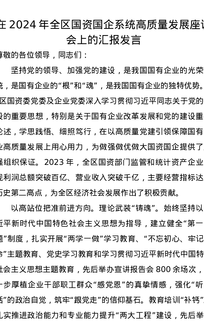 在2024年全区国资国企系统高质量发展座谈会上的汇报发言