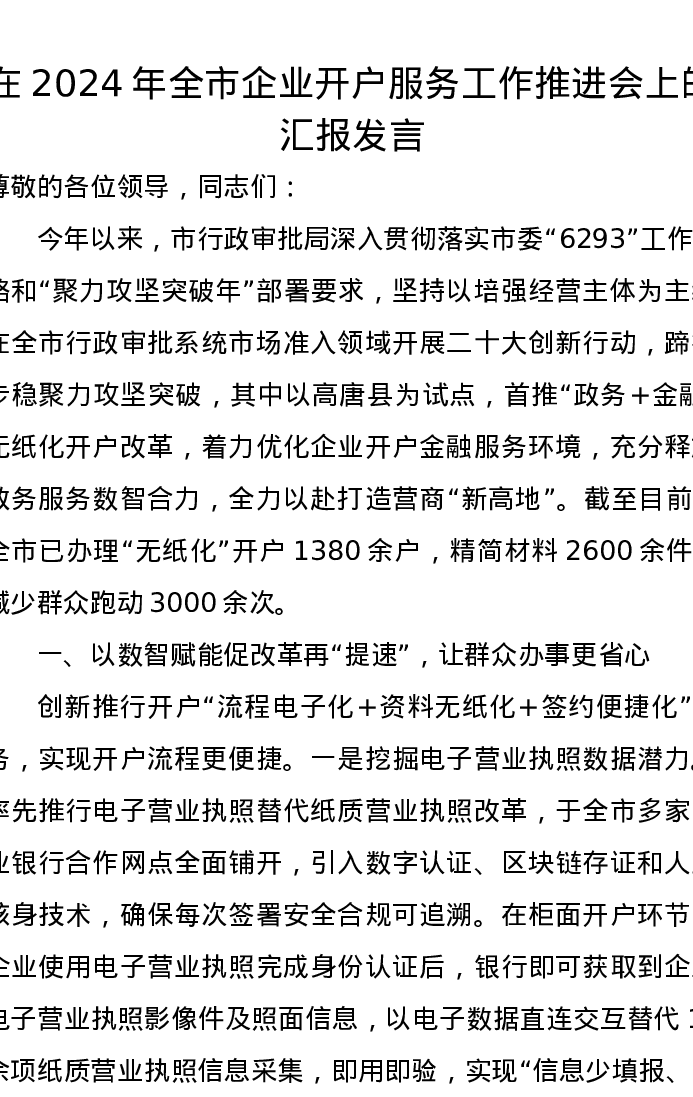 在2024年全市企业开户服务工作推进会上的汇报发言