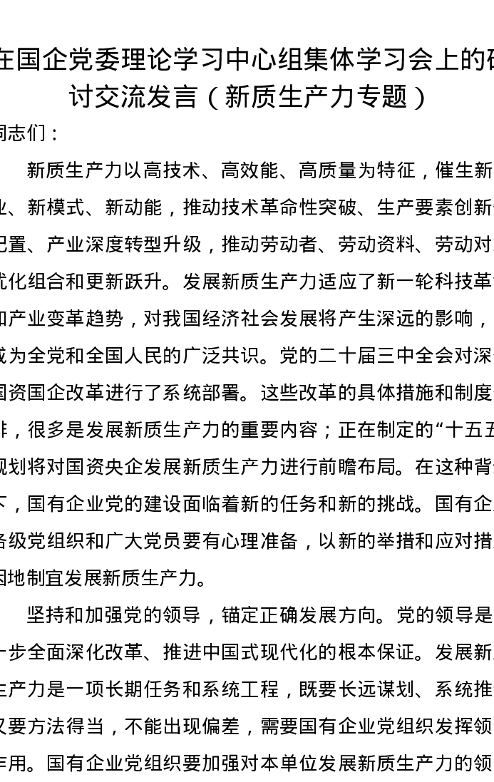在国企党委理论学习中心组集体学习会上的研讨交流发言(新质生产力专题)