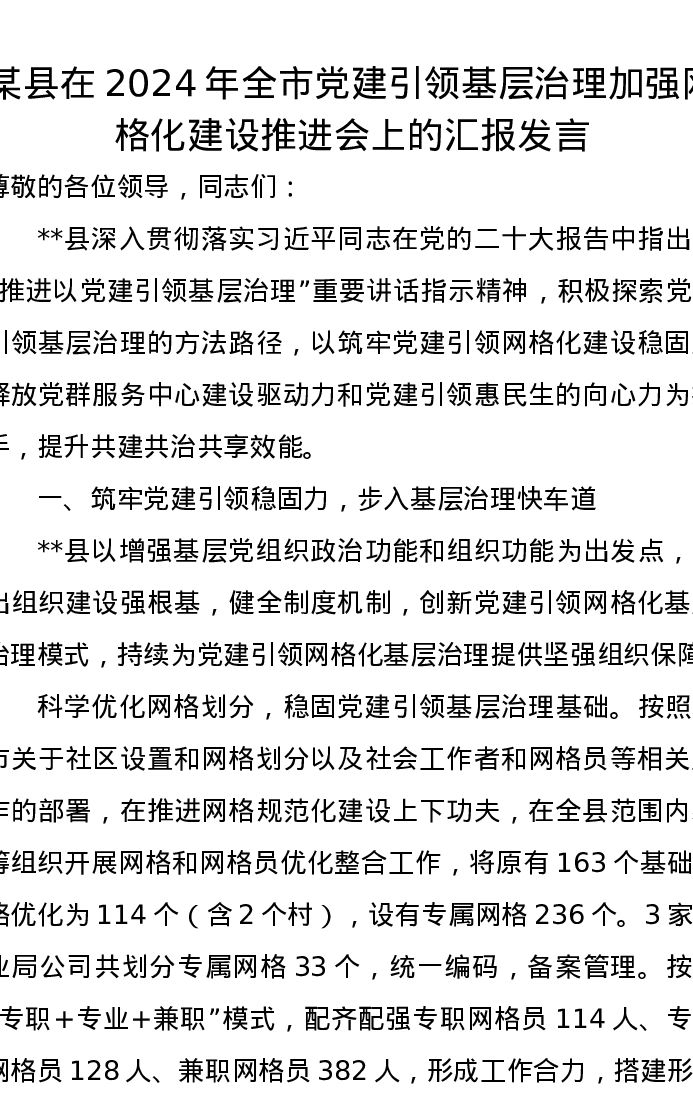 某县在2024年全市党建引领基层治理加强网格化建设推进会上的汇报发言