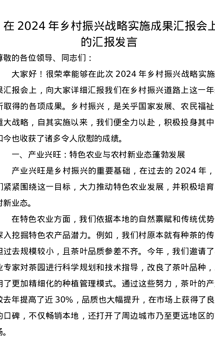 在,2024,年乡村振兴战略实施成果汇报会上的汇报发言