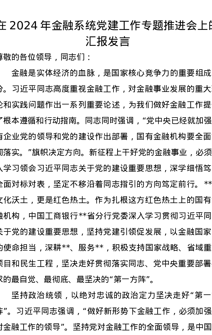 在2024年金融系统党建工作专题推进会上的汇报发言