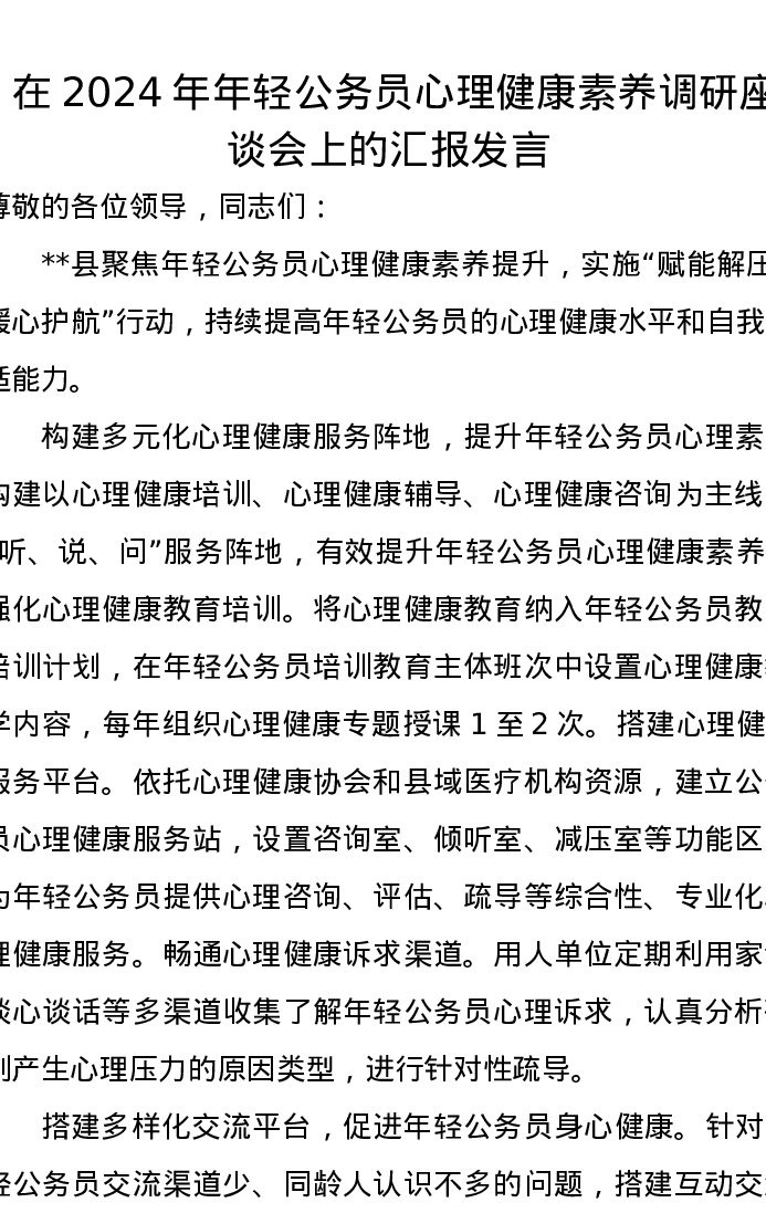 在2024年年轻公务员心理健康素养调研座谈会上的汇报发言