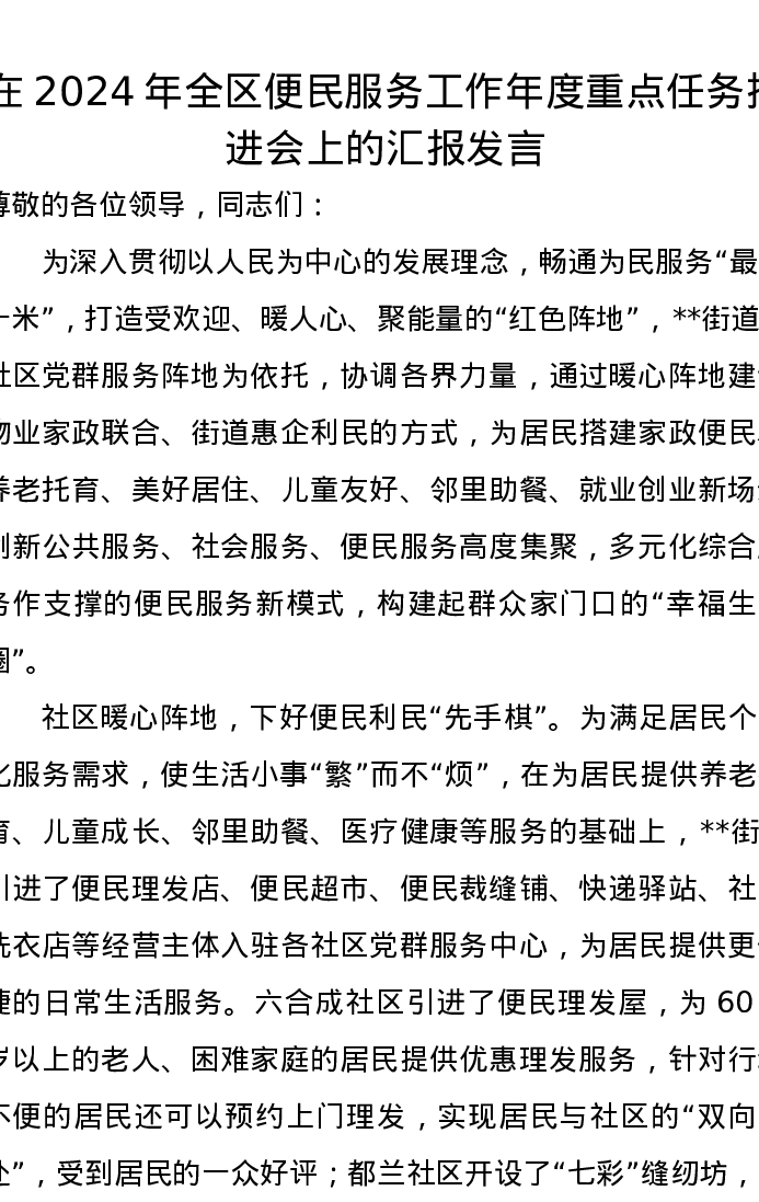 在2024年全区便民服务工作年度重点任务推进会上的汇报发言
