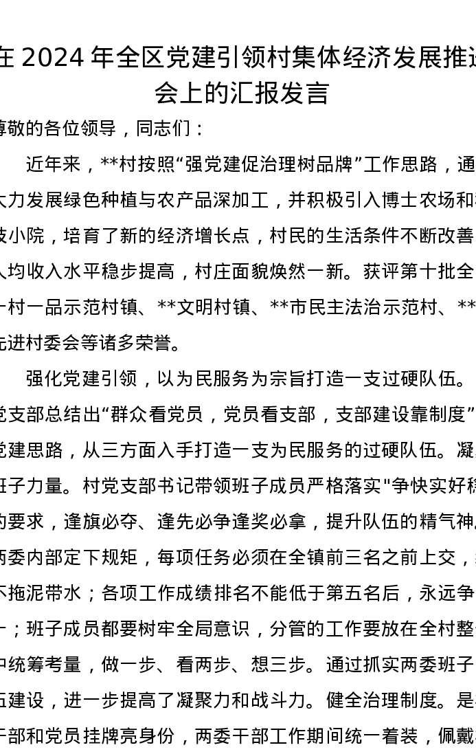 在2024年全区党建引领村集体经济发展推进会上的汇报发言