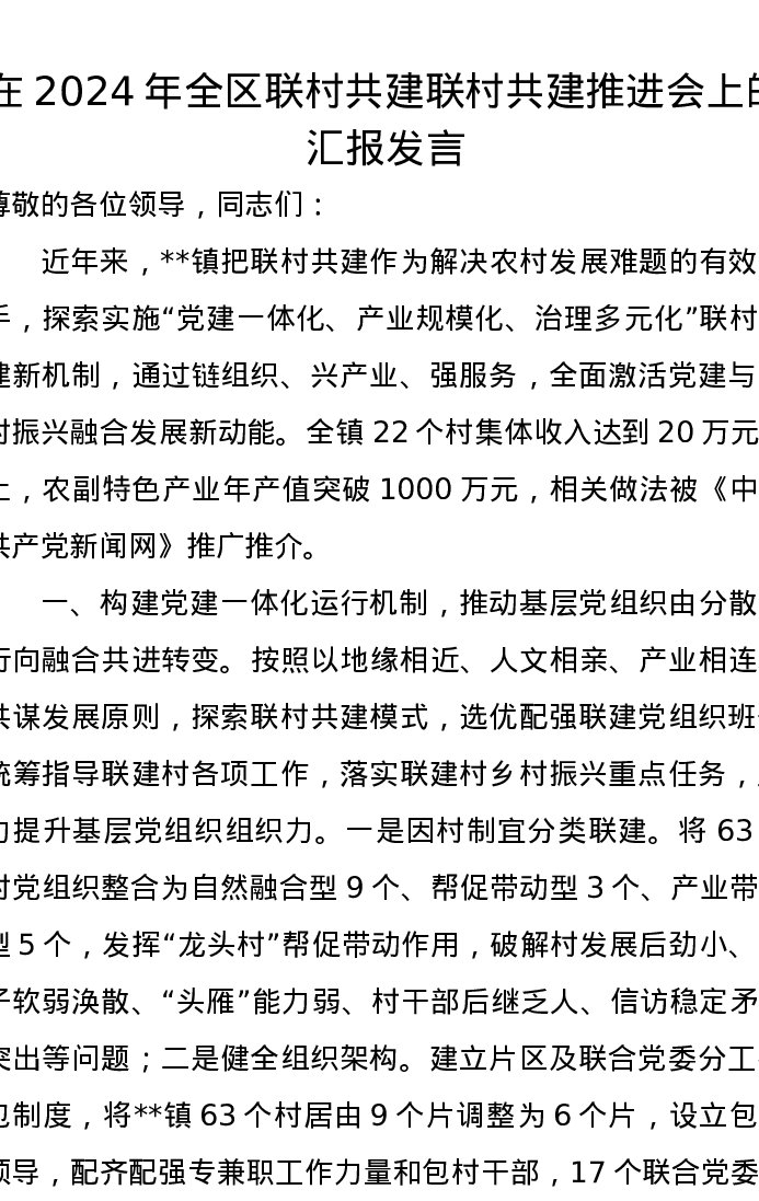 在2024年全区联村共建联村共建推进会上的汇报发言