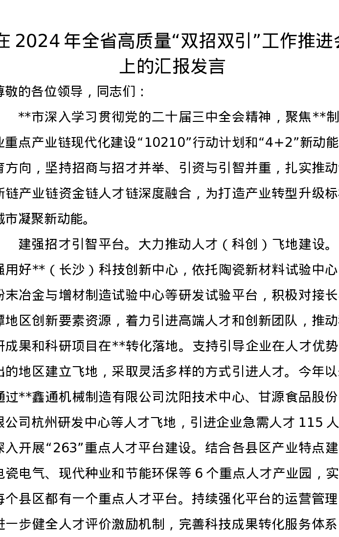 在2024年全省高质量“双招双引”工作推进会上的汇报发言