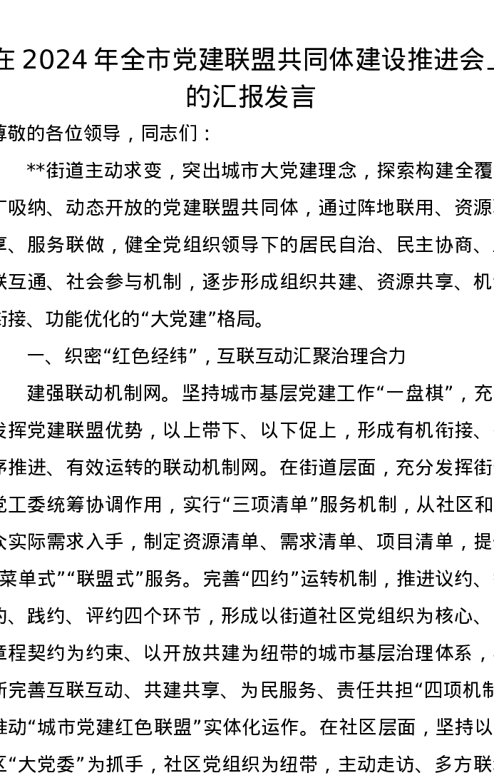 在2024年全市党建联盟共同体建设推进会上的汇报发言