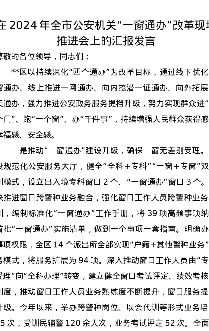 在2024年全市公安机关“一窗通办”改革现场推进会上的汇报发言