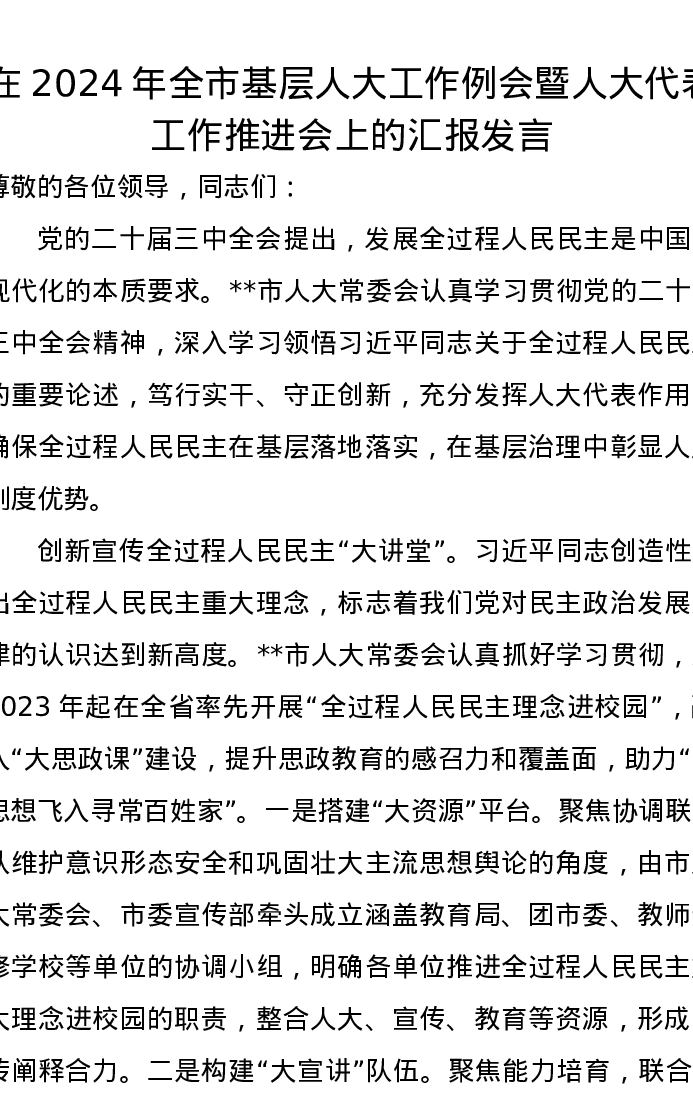 在2024年全市基层人大工作例会暨人大代表工作推进会上的汇报发言