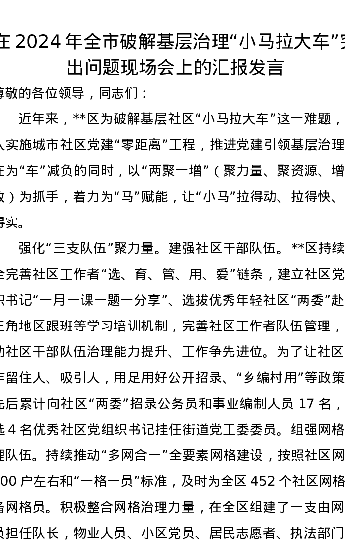 在2024年全市破解基层治理“小马拉大车”突出问题现场会上的汇报发言