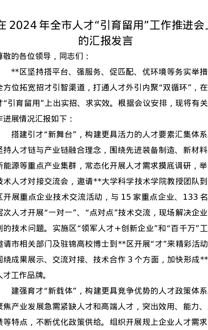 在2024年全市人才“引育留用”工作推进会上的汇报发言