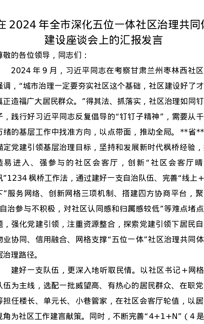 在2024年全市深化五位一体社区治理共同体建设座谈会上的汇报发言
