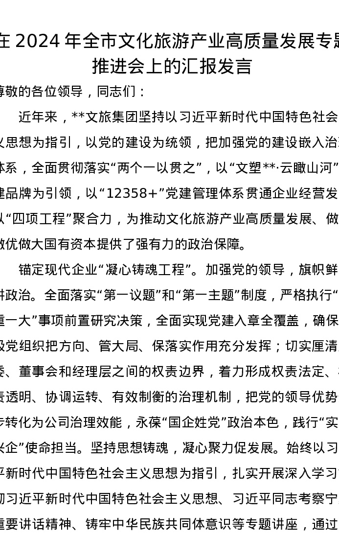 在2024年全市文化旅游产业高质量发展专题推进会上的汇报发言