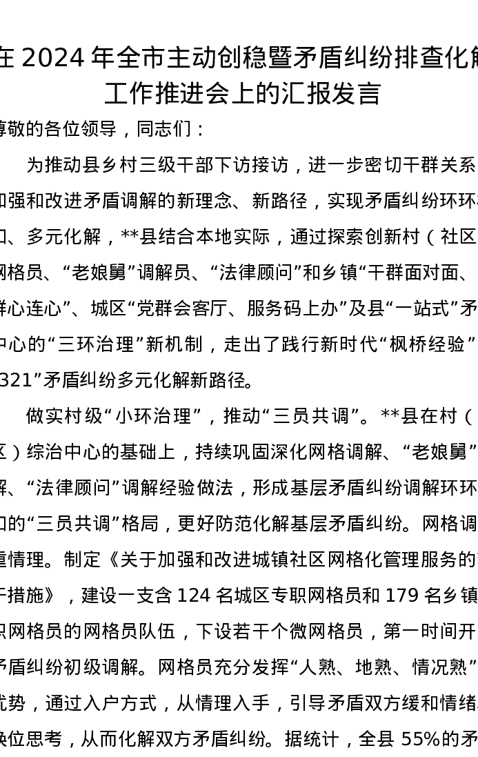 在2024年全市主动创稳暨矛盾纠纷排查化解工作推进会上的汇报发言