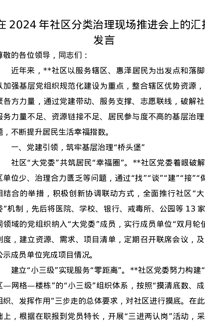 在2024年社区分类治理现场推进会上的汇报发言