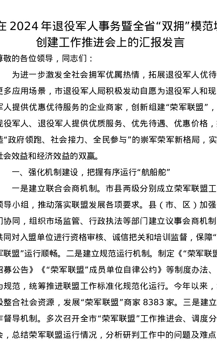 在2024年退役军人事务暨全省“双拥”模范城创建工作推进会上的汇报发言