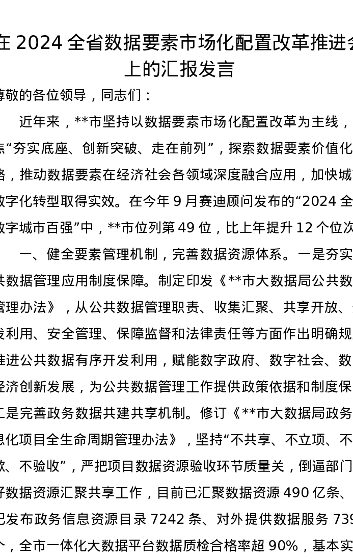 在2024全省数据要素市场化配置改革推进会上的汇报发言