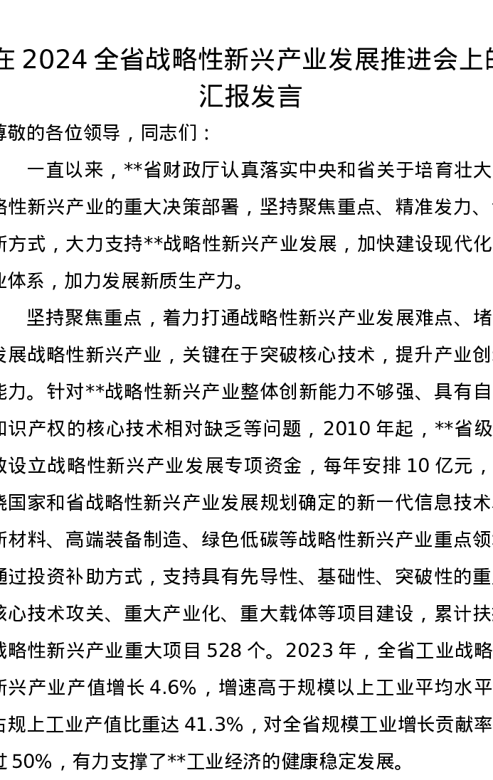 在2024全省战略性新兴产业发展推进会上的汇报发言