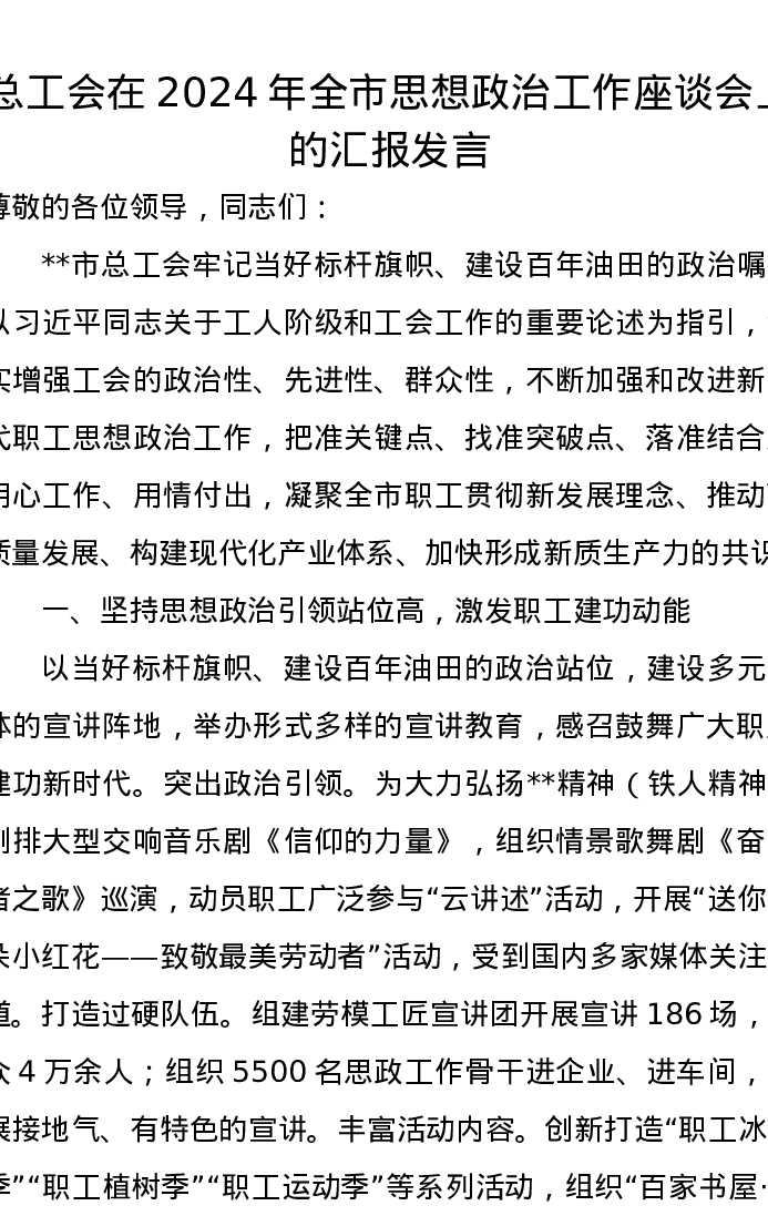 总工会在2024年全市思想政治工作座谈会上的汇报发言