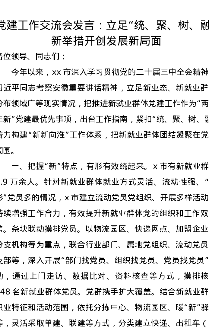 党建工作交流会发言:立足“统、聚、树、融”新举措,开创发展新局面