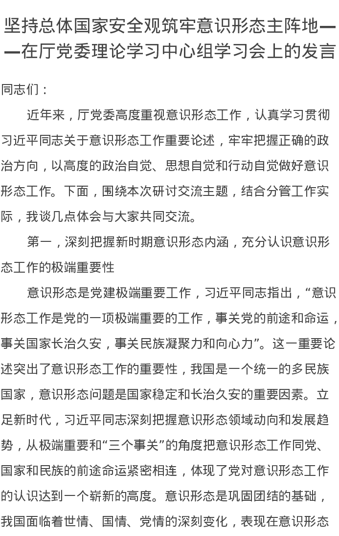 坚持总体国家安全观筑牢意识形态主阵地——在厅党委理论学习中心组学习会上的发言