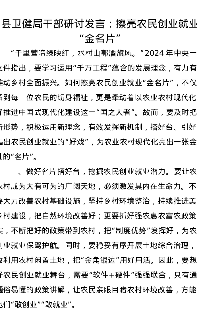 县卫健局干部研讨发言:擦亮农民创业就业“金名片”