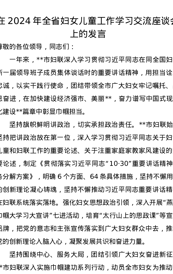 在2024年全省妇女儿童工作学习交流座谈会上的发言