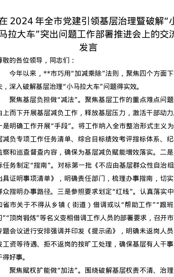 在2024年全市党建引领基层治理暨破解“小马拉大车”突出问题工作部署推进会上的交流发言