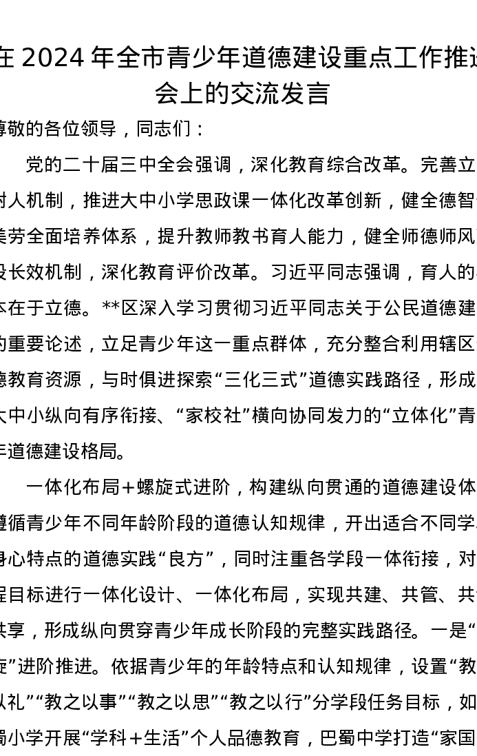在2024年全市青少年道德建设重点工作推进会上的交流发言